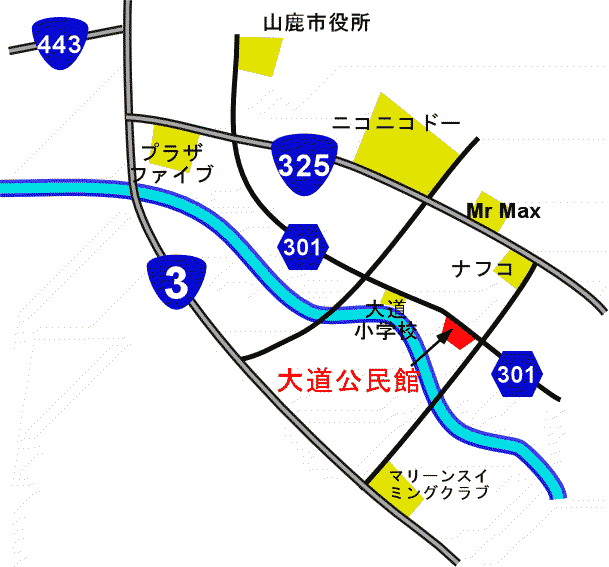 大道公民館を県道301号線から眺めた外観です.県道から少し奥まっておりますので,ご来場の際はお見落としないようご注意ください.
